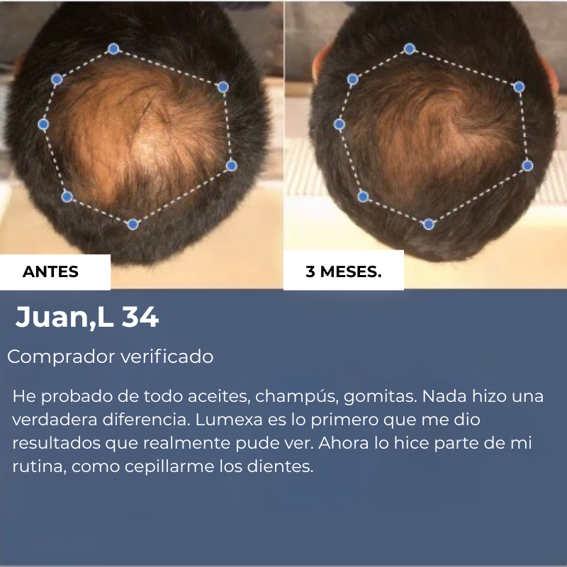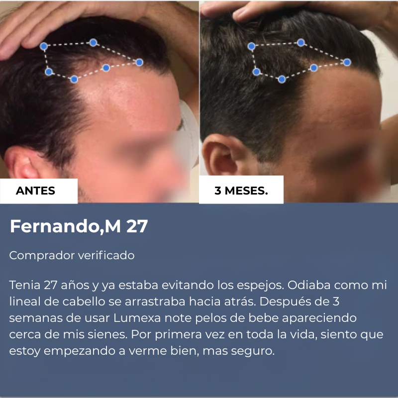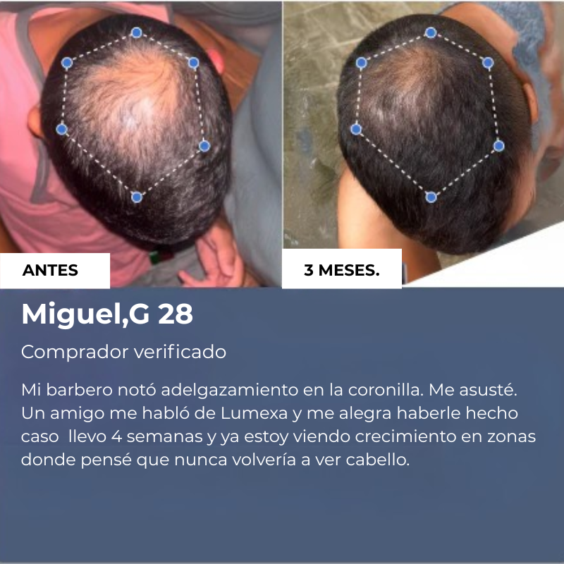 La mayoría de los hombres dicen que empiezan a notar el progreso en 2 a 4 semanas. Depende de la salud de tu cuero cabelludo y de tu constancia, pero el uso diario le da a tu línea capilar el soporte que necesita para lucir más abundante con el tiempo.